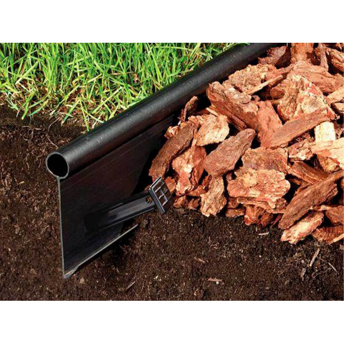 Бордюр вкапывается в грунт, трубка остается сверху и разделяет декоративные зоны. Для предотвращения выдавливания из земли рекомендуется использовать 16-20 крепежных колышков на 20 метров бордюра.