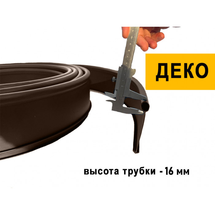 Бордюр садовый ДЕКО черный, 10 метров Аналог бордюров Канта и Кантри. Бордюр длиной 10 метров с трубкой по верхней части.Толщина бордюра 1 мм, трубка диаметром 16 мм. Полная высота бордюра с трубкой 10 см. Садовый бордюр используют при благоустройстве парков и скверов, приусадебных участков, пешеходных зон и территорий частных домов. Верхняя трубка применяется для разграничивания зон между газонами, грядками, клумбами, дорожками на садовых участках.Аккуратное обрамление преображает ландшафт и выгодно подчеркивает разнообразие композиций на участке. Бордюр вкапывается в грунт, трубка остается сверху и разделяет декоративные зоны. Для предотвращения выдавливания из земли рекомендуется использовать 8-10 крепежных колышков на 10 метров бордюра. Благодаря свойствам используемого материала, бордюр не разрушается под воздействием солнечных лучей. V-образная нижняя кромка дополнительно фиксирует бордюр в грунте, в виде якоря Гибкость делает возможным применение бордюра при обрамлении сложных геометрических форм, в том числе малых радиусов.