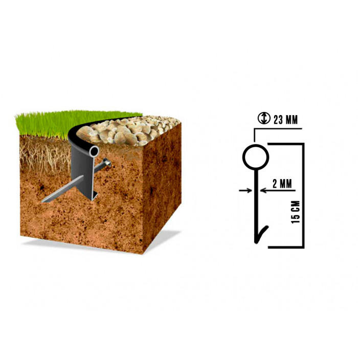 Бордюр вкапывается в грунт, трубка остается сверху и разделяет декоративные зоны. Для предотвращения выдавливания из земли рекомендуется использовать 8-10 крепежных колышков на 10 метров бордюра.