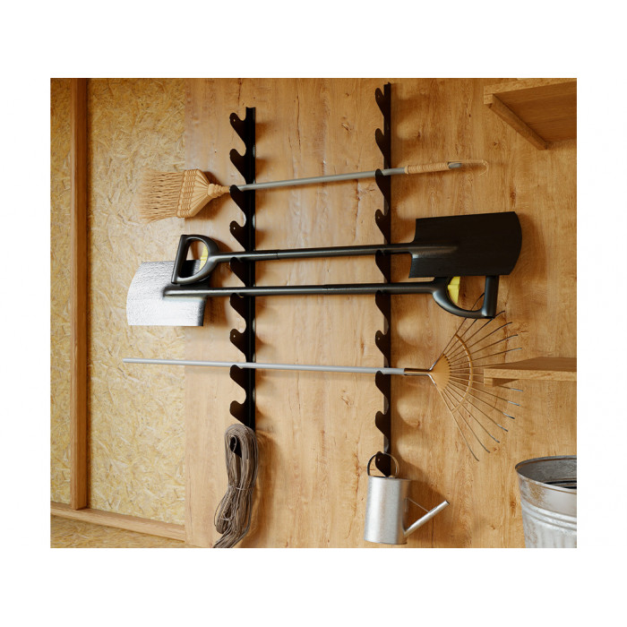 Настенный держатель для организации аккуратного, компактного хранения садового инвентаря и хозяйственных инструментов. Позволяет разместить 10 единиц инвентаря. Изделие состоит из дв...