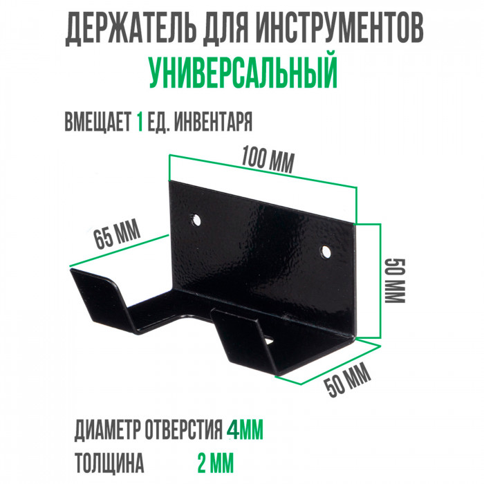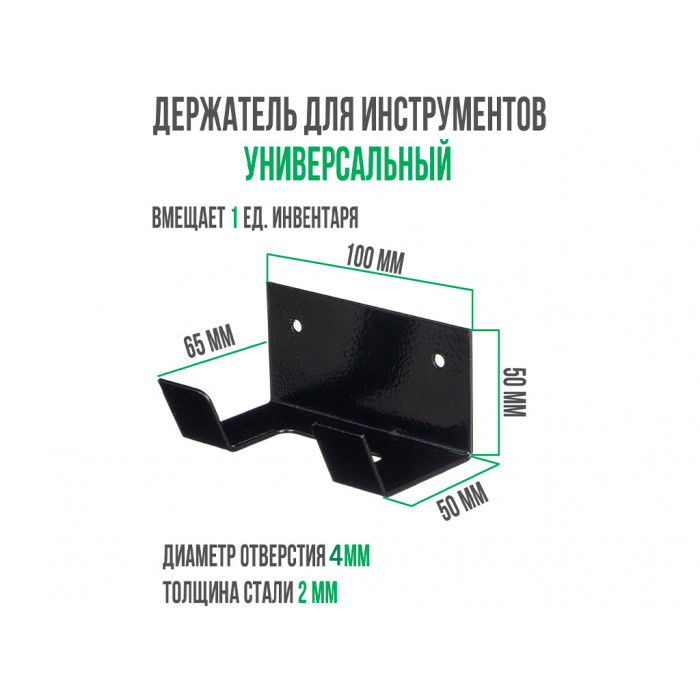 Настенный держатель для организации аккуратного, компактного хранения садового инвентаря и хозяйственных инструментов. Позволяет разместить 4 единицы инвентаря. Изделие состоит из четырёх кронштейнов, которые крепятся на стене. Материал – металл, покрытие – порошковая краска шагрень, толщина -2 мм. Размер одного кронштейна 10 см*5 см*6,5 см. Саморезы входят в комплект.
