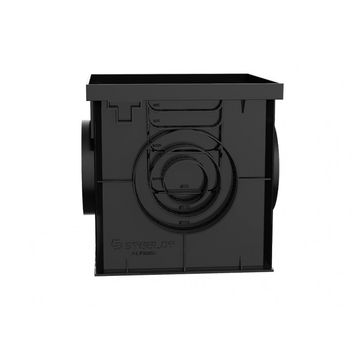 Прямоугольная конструкция оснащена патрубками и шаблонами для монтажа труб и лотков. На верхней части расположены ответные пазы для фиксации защелок решетки. Отводы для труб расположены по всем стенкам. Возможно подключение пластиковых трубопроводов раструбной и фасонной частью. При необходимости дождеприемники располагаются друг над другом, что увеличивает вместительность колодца. В комплектующих предусмотрены специальные перегородки-сифоны, которые задерживают неприятный запах. Это позволяет владельцам дач или коммунальным службам увеличить интервал обслуживания системы.