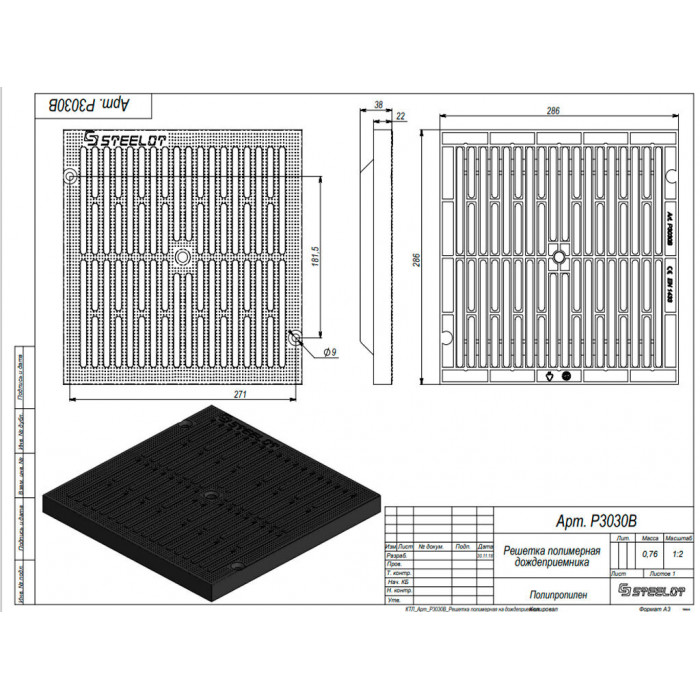 Класс нагрузки А, Длина - 286 мм, Ширина - 286 мм, Высота - 38 мм