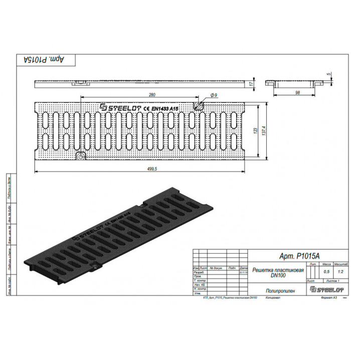 Решетка пластиковая SteeStart DN100 А15 Если трудно разобраться, позвоните нам и консультант поможет с подбором комплектующих. Класс нагрузки А15, Длина - 499 мм, Ширина - 137 мм, Высота - 17 мм Пластиковая решетка для лотка защищает системы локального сбора дождевой и талой воды. Конструкция изготовлена из адаптированного полимера и предназначена для пешеходной зоны. Модель устанавливается в пешеходных зонах, парках, скверах и других местах, где исключается перемещение тяжелой техники. Применение: Устанавливается с водоотводным лотком  Устанавливаются в пешеходных зонах, парках, скверах Для благоустройства частных территорий и индивидуальных застроек Преимущества: Обладает стойкостью к кислотам, щелочам и коррозии, нетребовательна к погодным условиям и проста в монтаже. Отличается высокой пропускной способностью Долговечность — полимерные изделия не подвержены коррозии и температурным перепадам. Служат для сбора воды в течение 50 лет и дольше.