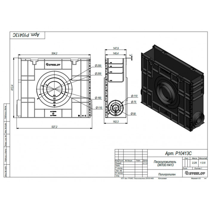 Пескоуловитель пластиковый SteeStart DN100 H413 низкий борт Если трудно разобраться, позвоните нам и консультант поможет с подбором комплектующих. Класс нагрузки А15 В125 С250, Длина 504 мм, Ширина 148/162 мм Высота 413 мм, Гидравлическая высота 405 мм Предназначен для предотвращения попадания в ливневую канализацию песка и прочего мусора. Сточная вода, освобожденная от взвешенных частиц и других грубых примесей поступает в дренажную систему.  Пескоуловитель устанавливается в конце линии пластиковых лотков Стилот SteeStart Dn100 и является переходом к водоотводящей трубе.  К этому пескоуловителю Вам понадобится: Решетка пластиковая Решетка пластиковая или Решетка стальная штампованная Решетка стальная или Решетка чугунная "Волна" Решетка чугунная Крепеж для решеток Герметик для монтажа Герметик для монтажа Применение: Для пешеходных зон, тротуаров, велосипедных дорожек, обочины дорог Для благоустройства дворов, скверов, садов, парков, искусственных ландшафтов Для благоустройства территорий, индивидуальных застроек, гаражей Парковки и стоянки автомобилей Для предприятий автосервиса Преимущества: Небольшой вес упрощает перевозку и установку Прочность — выдерживают значительные нагрузки Долговечность — полимерные изделия не подвержены коррозии и температурным перепадам. Служат для сбора воды в течение 50 лет и дольше.