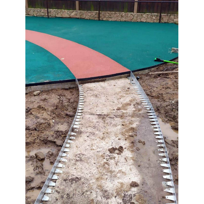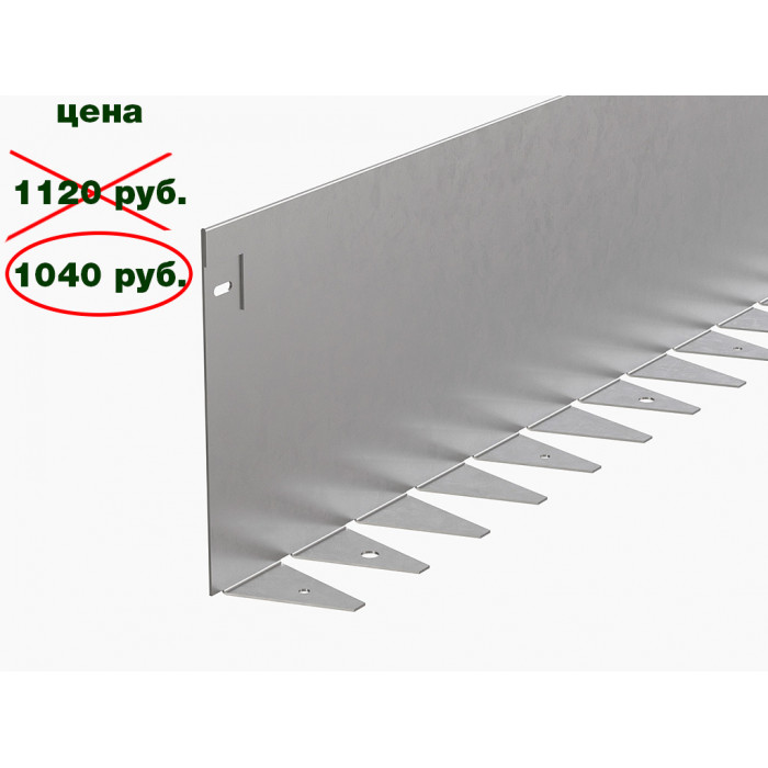Толщина вертикальной стенки в верхней части 3 мм. Один бордюр длиной 120 см. Секции бордюра соединяются между собой вытяжными заклепками, заклепки в комплекте.